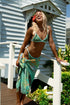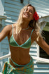 Las telas lisas de colores combinados pueden desteñir levemente entre sí y perder intensidad con el uso, la exposición al sol y los químicos de las piletas. Evitar el contacto de la bikini húmeda con otras prendas y el roce de la misma con superficies ásperas para no dañar la lycra.